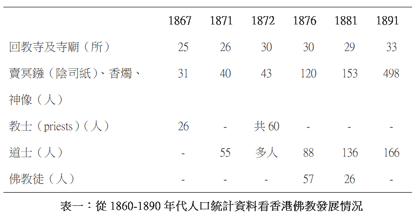 表一顯示,所有數字(佛教徒例外)都是隨着人口的增加而有所增長。寺廟的數目增長幅度較慢,但在20多年間,仍增加了幾所。可堪注意的是佛教徒(Buddhist),這個詞語是首次出現在政府報告。1876年,調查所得有57名自稱是佛教徒;唯5年後,卻只有26名。1891年則沒有記載。