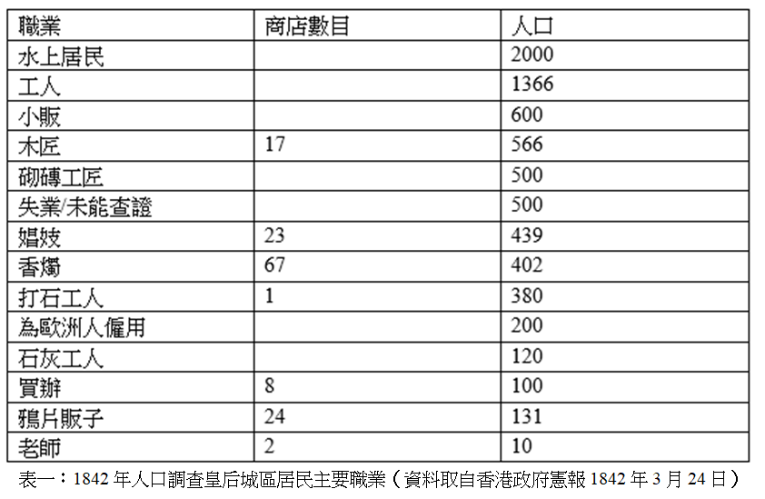 香港這個最蕞爾小島,1841年為英人攫取時,被形容為不毛之地(barren rock),人口只有7,450人(CO129/12: 305。CO即Colonial Office,英國殖民地辦公室的簡稱。CO 129 為香港的檔號,主要紀錄殖民地總督的工作報告及與殖民地大臣的信函。檔案按年劃分,由1841起至1951止,共629檔,數萬條資料。是研究香港史不可或缺的原始資料。)。一年後,即1842年,殖民地政府又做了一次人口調查,當時主要居住地「皇后城」(Queenstown),約現今中、上環等地人口為8,181人,加上其他較偏遠地區,如赤柱、香港仔、黃泥涌等村落,總人口共12,861人(詳見香港政府憲報1842年3月24日)。調查還臚列了華人在皇后城區主要職業: